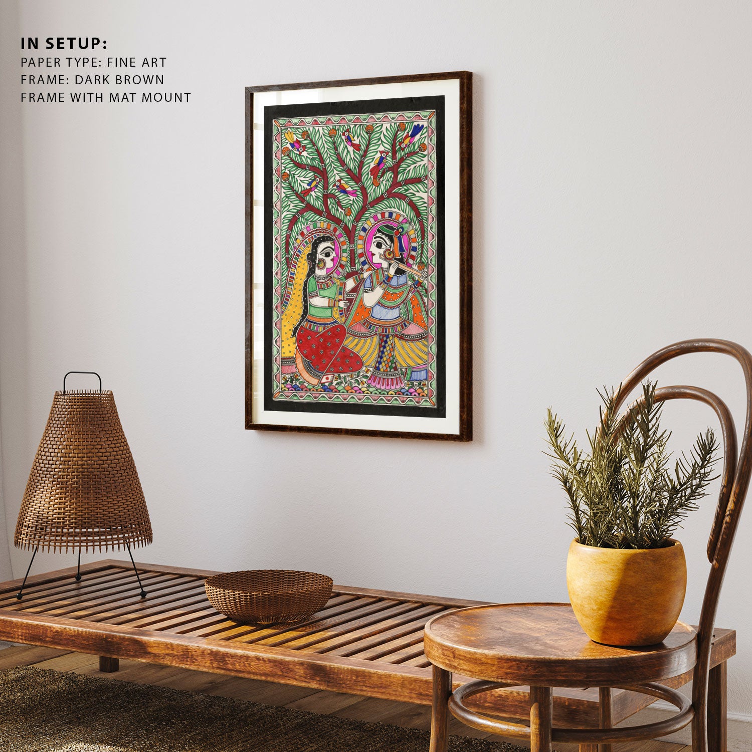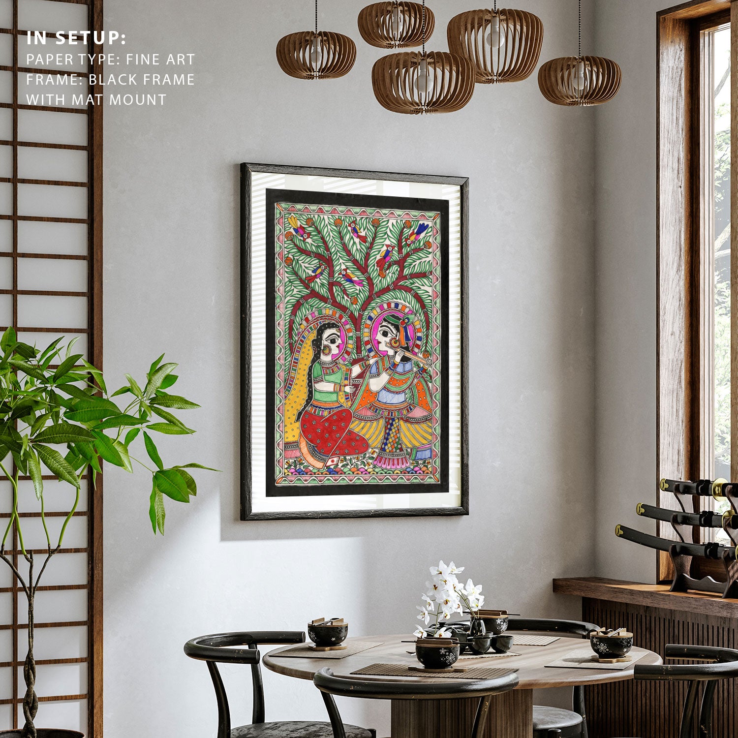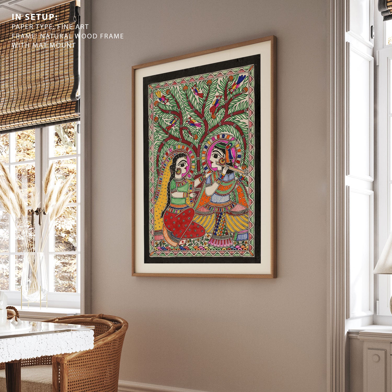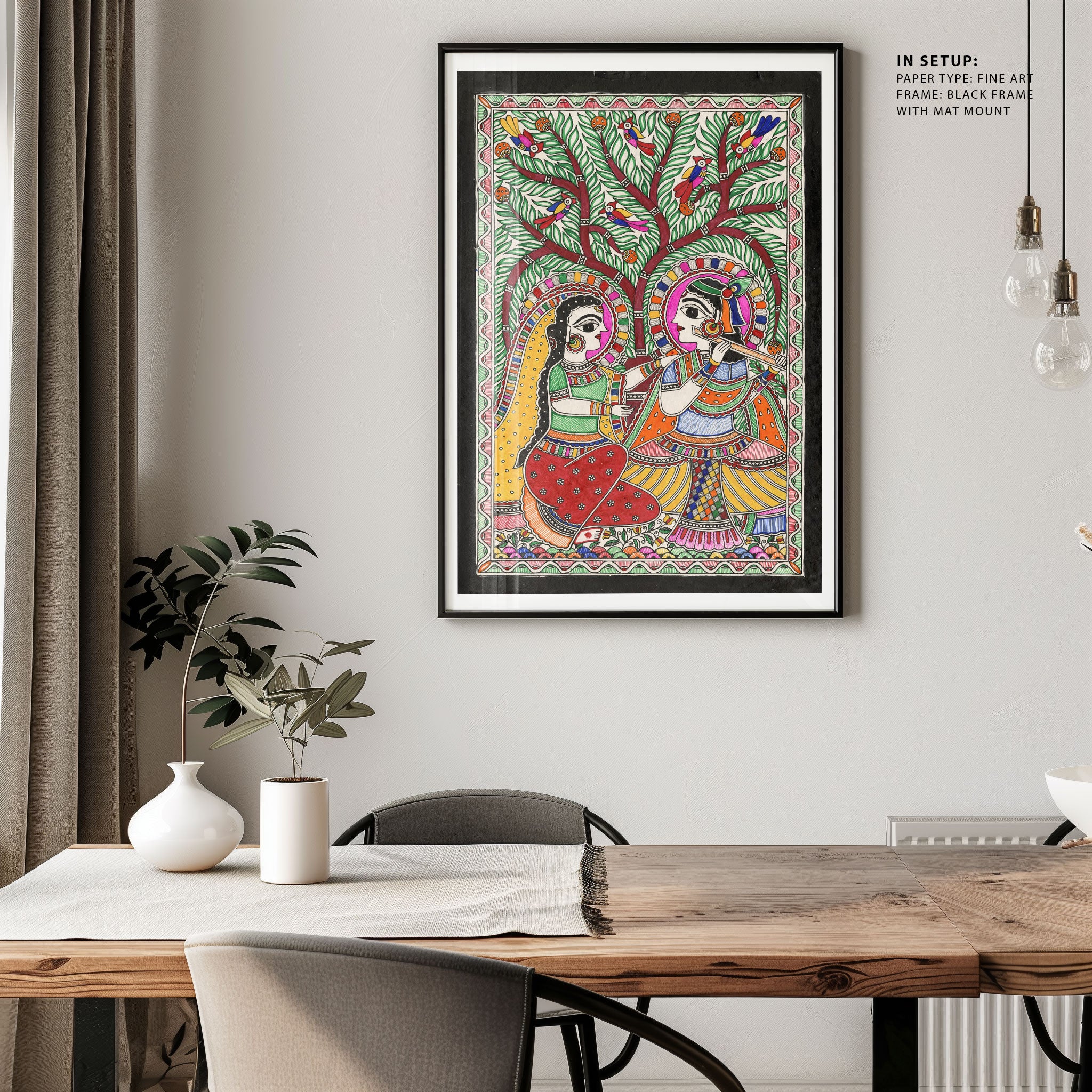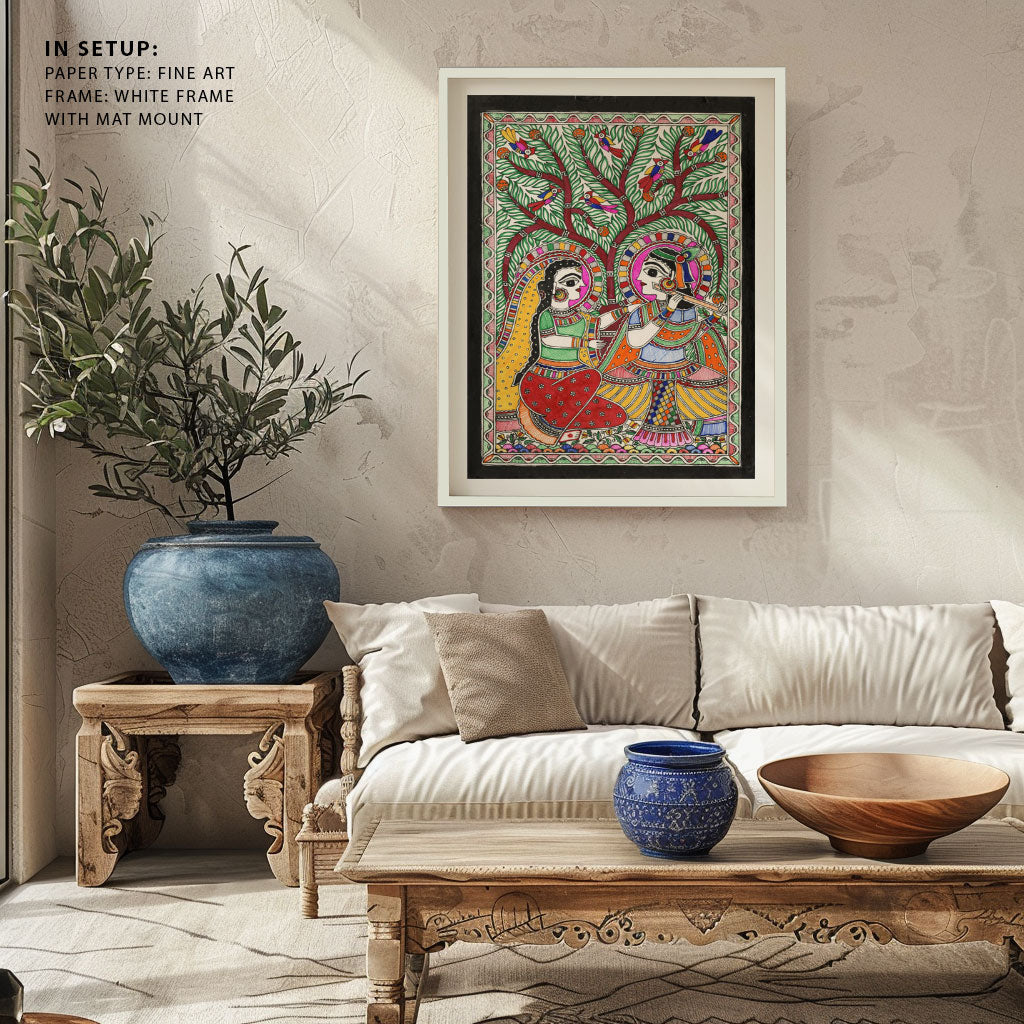 Radha Krishna Vibe Madhubani Art from the Madhubani Paintings Collection is produced on Premium Museum Grade Canvas and Hahnemuhle Fine Art Media. This beautiful Madhubani Painting Art Print product is made with a matte finish and premium quality with vibrant colors. These Madhubani Miniature Paintings Art Prints are produced with the most extreme shading precision and using the most advanced giclee printing technique in the world. We use the same standard that the various museums and art galleries use across the globe to recreate the Madhubani Miniature Paintings Art Prints. These Madhubani Paintings are perfect for you if you're a Madhubani or Indian Culture Lover or if you want to add a Traditional Look to your space. The vibrancy of colors and the unique detailing of every Madhubani Painting Art Print makes them the best in so many ways. This Madhubani Art Print will add charm to any room in your home. These Madhubani Painting Art Prints can be the perfect gift to your friends, colleagues, or family as they sync in very well in your Bedroom, living room, lobby, Balcony, Bathroom, etc.