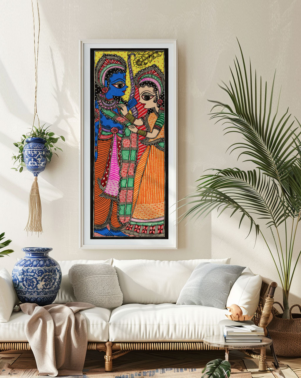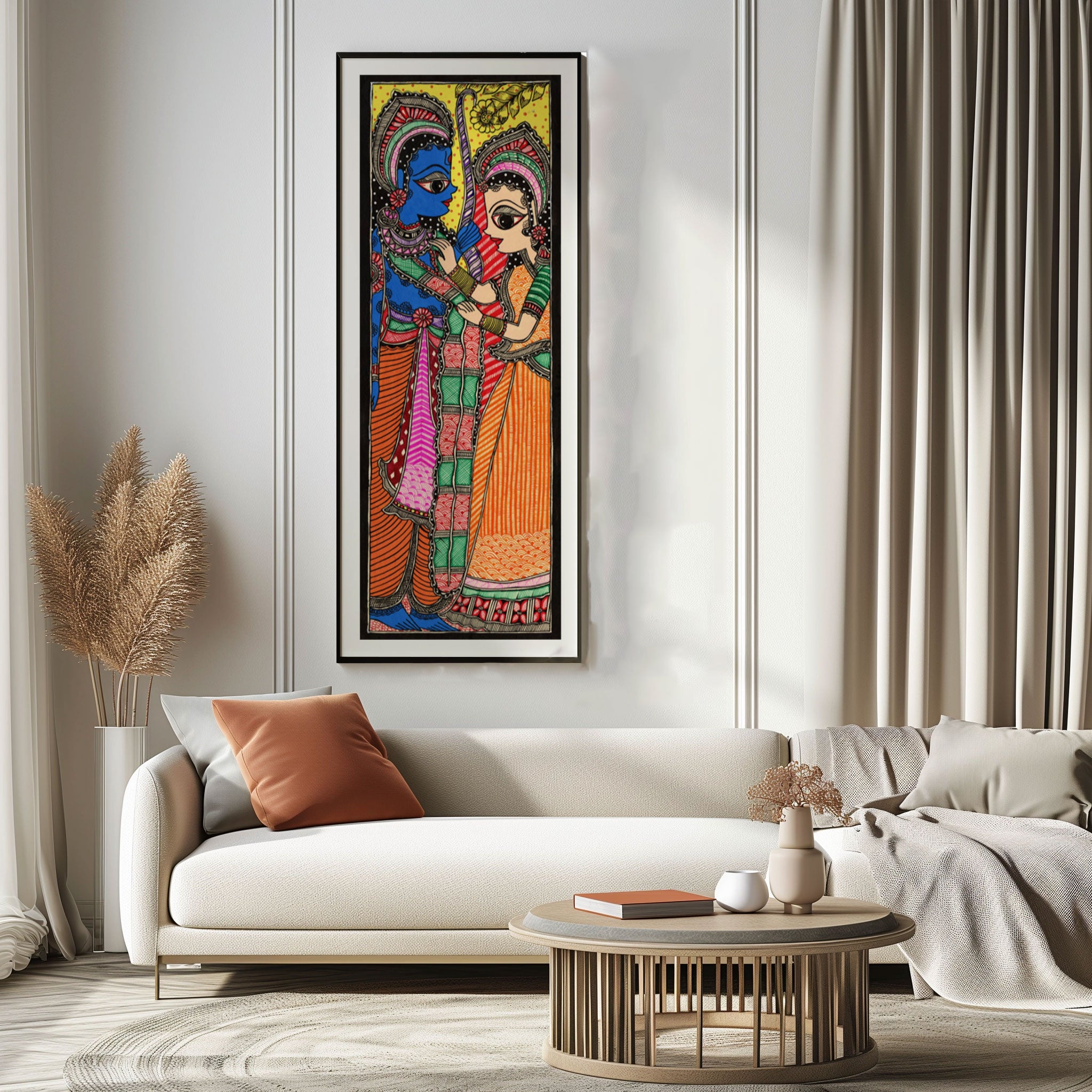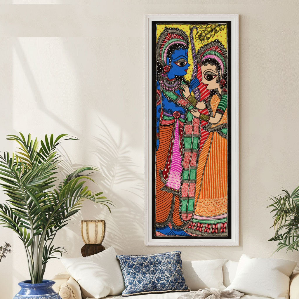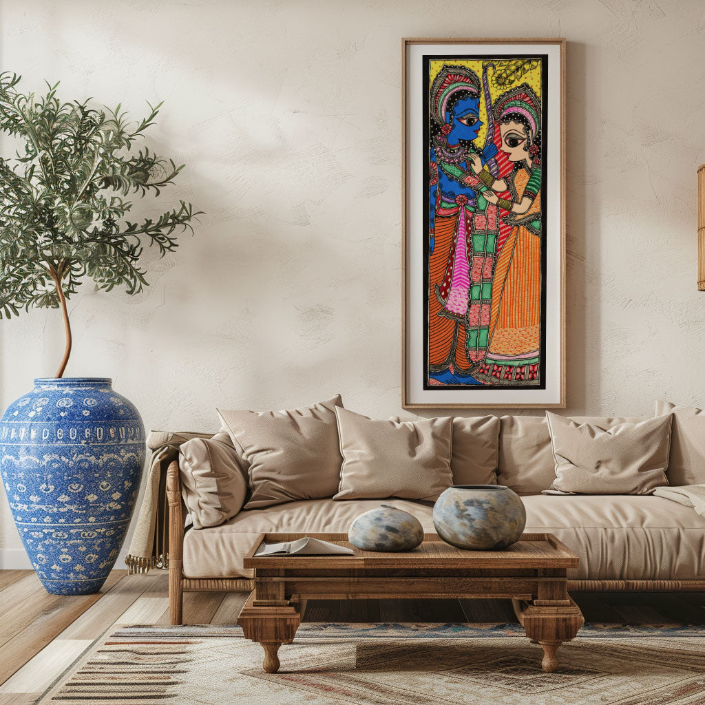 Sita Ram Mithila Art from the Madhubani Paintings Collection is produced on Premium Museum Grade Canvas and Hahnemuhle Fine Art Media. This beautiful Madhubani Painting Art Print product is made with a matte finish and premium quality with vibrant colors. These Madhubani Miniature Paintings Art Prints are produced with the most extreme shading precision and using the most advanced giclee printing technique in the world. We use the same standard that the various museums and art galleries use across the globe to recreate the Madhubani Miniature Paintings Art Prints. These Madhubani Paintings are perfect for you if you're a Madhubani or Indian Culture Lover or if you want to add a Traditional Look to your space. The vibrancy of colors and the unique detailing of every Madhubani Painting Art Print makes them the best in so many ways. This Madhubani Art Print will add charm to any room in your home. These Madhubani Painting Art Prints can be the perfect gift to your friends, colleagues, or family as they sync in very well in your Bedroom, living room, lobby, Balcony, Bathroom, etc.