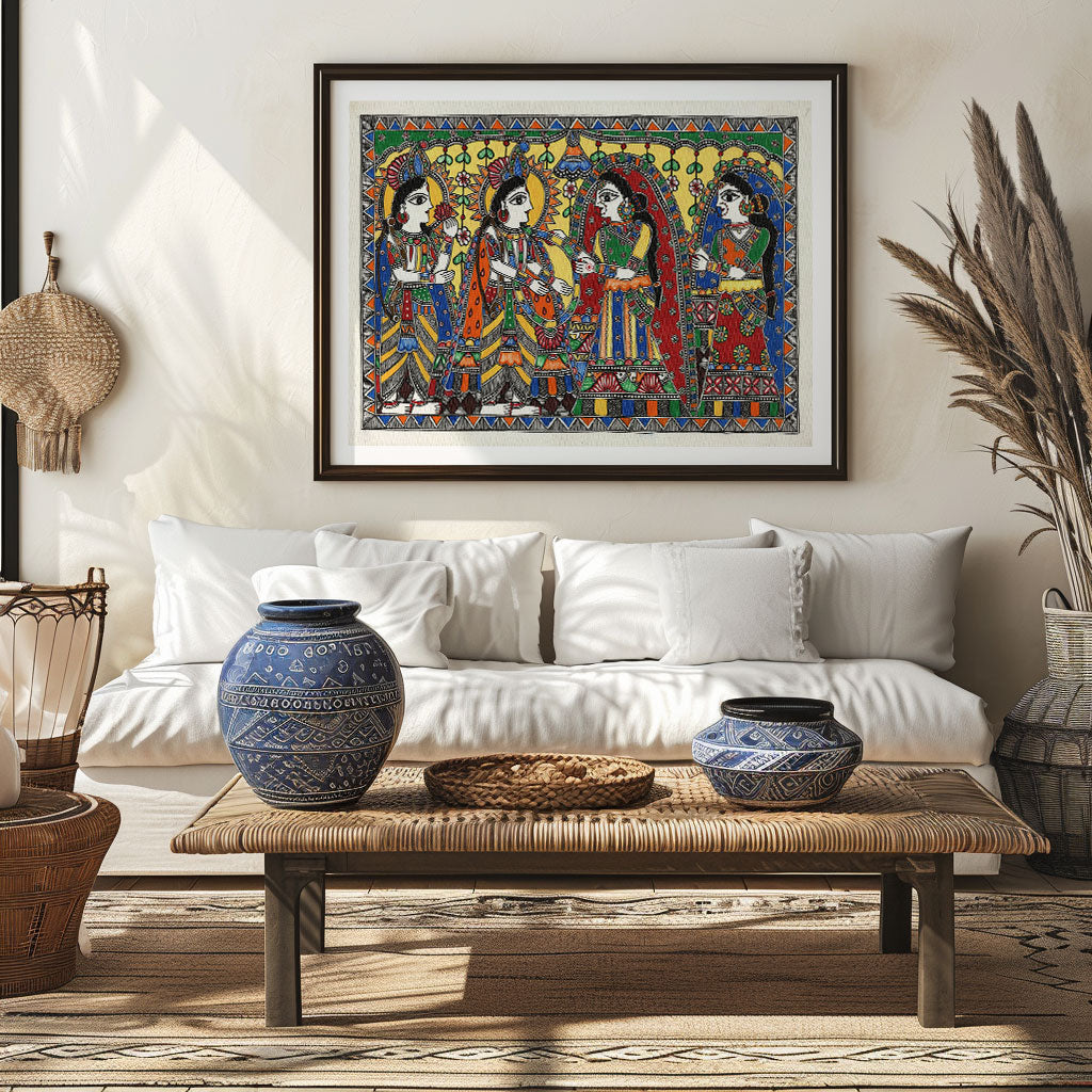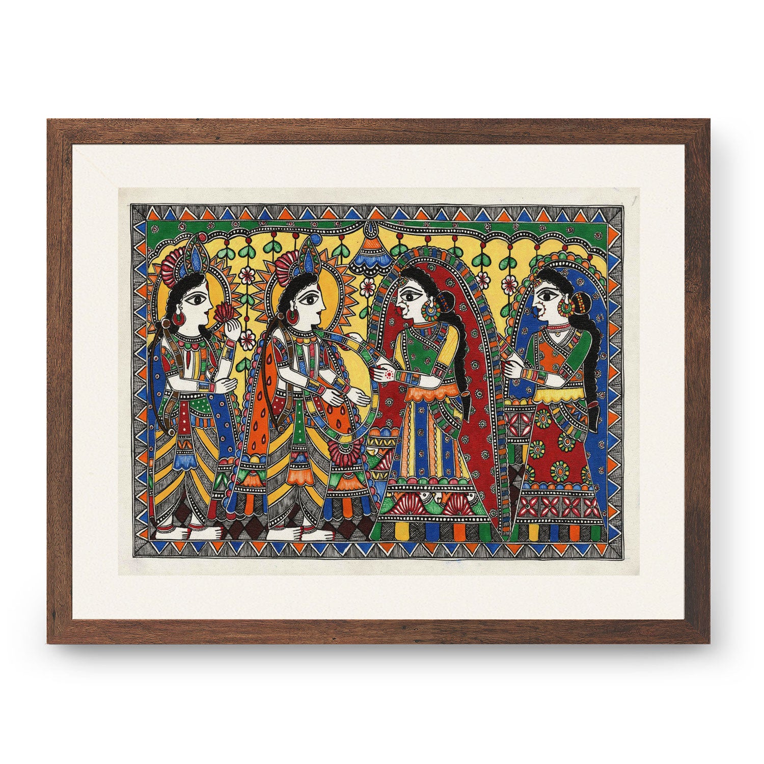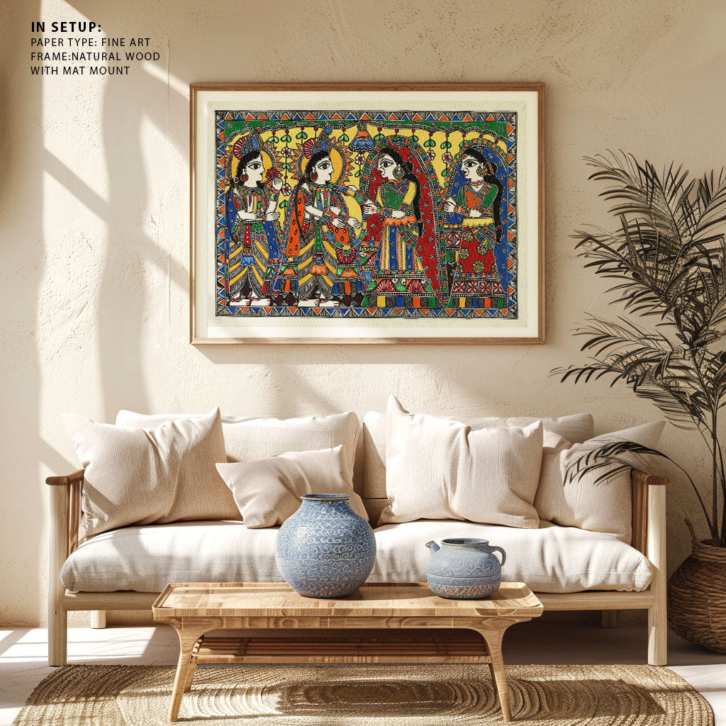 Sitaram Traditional Painting Madhubani Art from the Madhubani Paintings Collection is produced on Premium Museum Grade Canvas and Hahnemuhle Fine Art Media. This beautiful Madhubani Painting Art Print product is made with a matte finish and premium quality with vibrant colors. These Madhubani Miniature Paintings Art Prints are produced with the most extreme shading precision and using the most advanced giclee printing technique in the world. We use the same standard that the various museums and art galleries use across the globe to recreate the Madhubani Miniature Paintings Art Prints. These Madhubani Paintings are perfect for you if you're a Madhubani or Indian Culture Lover or if you want to add a Traditional Look to your space. The vibrancy of colors and the unique detailing of every Madhubani Painting Art Print makes them the best in so many ways. This Madhubani Art Print will add charm to any room in your home. These Madhubani Painting Art Prints can be the perfect gift to your friends, colleagues, or family as they sync in very well in your Bedroom, living room, lobby, Balcony, Bathroom, etc.
