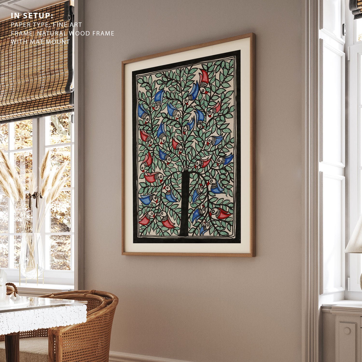 Tree and Birds Traditional Madhubani Art from the Madhubani Paintings Collection is produced on Premium Museum Grade Canvas and Hahnemuhle Fine Art Media. This beautiful Madhubani Painting Art Print product is made with a matte finish and premium quality with vibrant colors. These Madhubani Miniature Paintings Art Prints are produced with the most extreme shading precision and using the most advanced giclee printing technique in the world. We use the same standard that the various museums and art galleries use across the globe to recreate the Madhubani Miniature Paintings Art Prints. These Madhubani Paintings are perfect for you if you're a Madhubani or Indian Culture Lover or if you want to add a Traditional Look to your space. The vibrancy of colors and the unique detailing of every Madhubani Painting Art Print makes them the best in so many ways. This Madhubani Art Print will add charm to any room in your home. These Madhubani Painting Art Prints can be the perfect gift to your friends, colleagues, or family as they sync in very well in your Bedroom, living room, lobby, Balcony, Bathroom, etc.