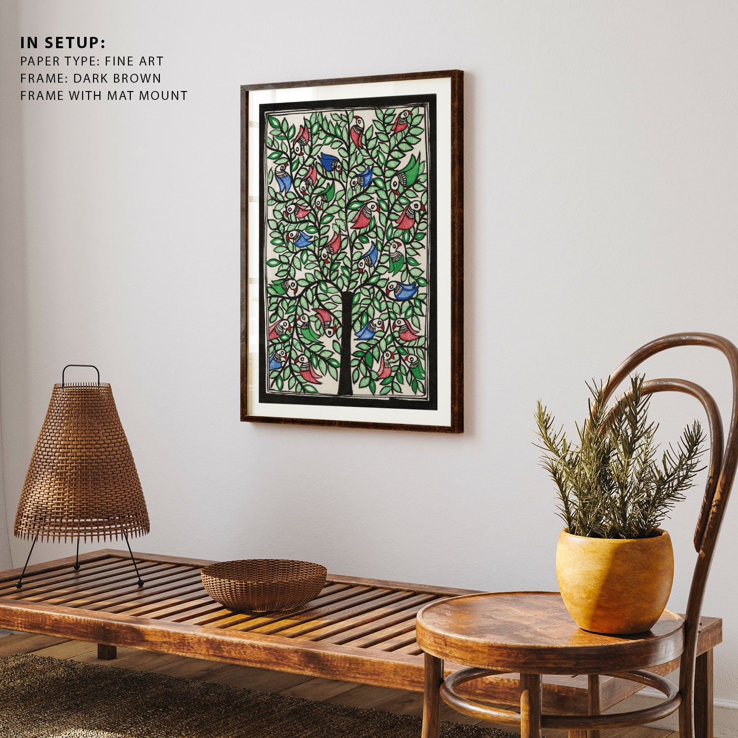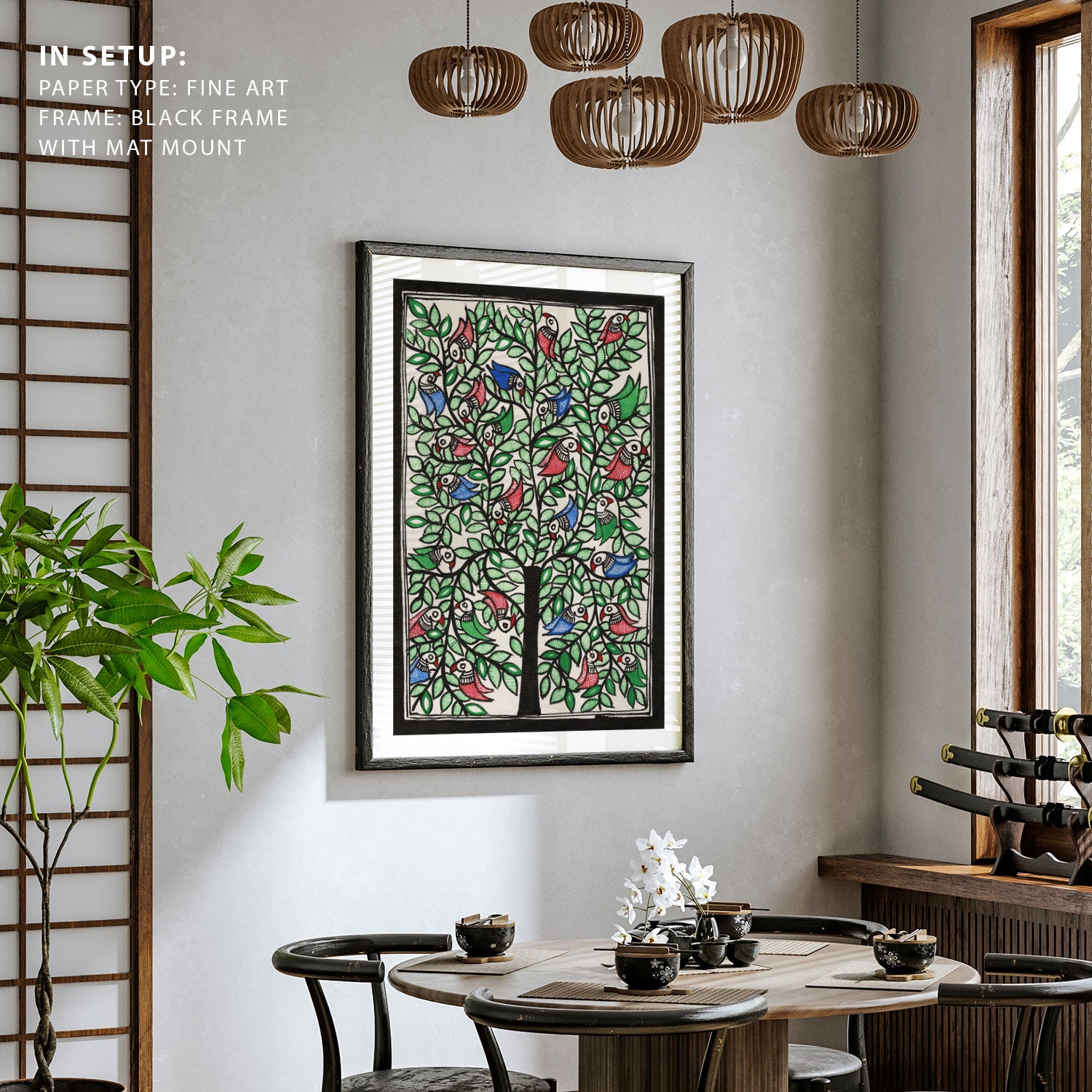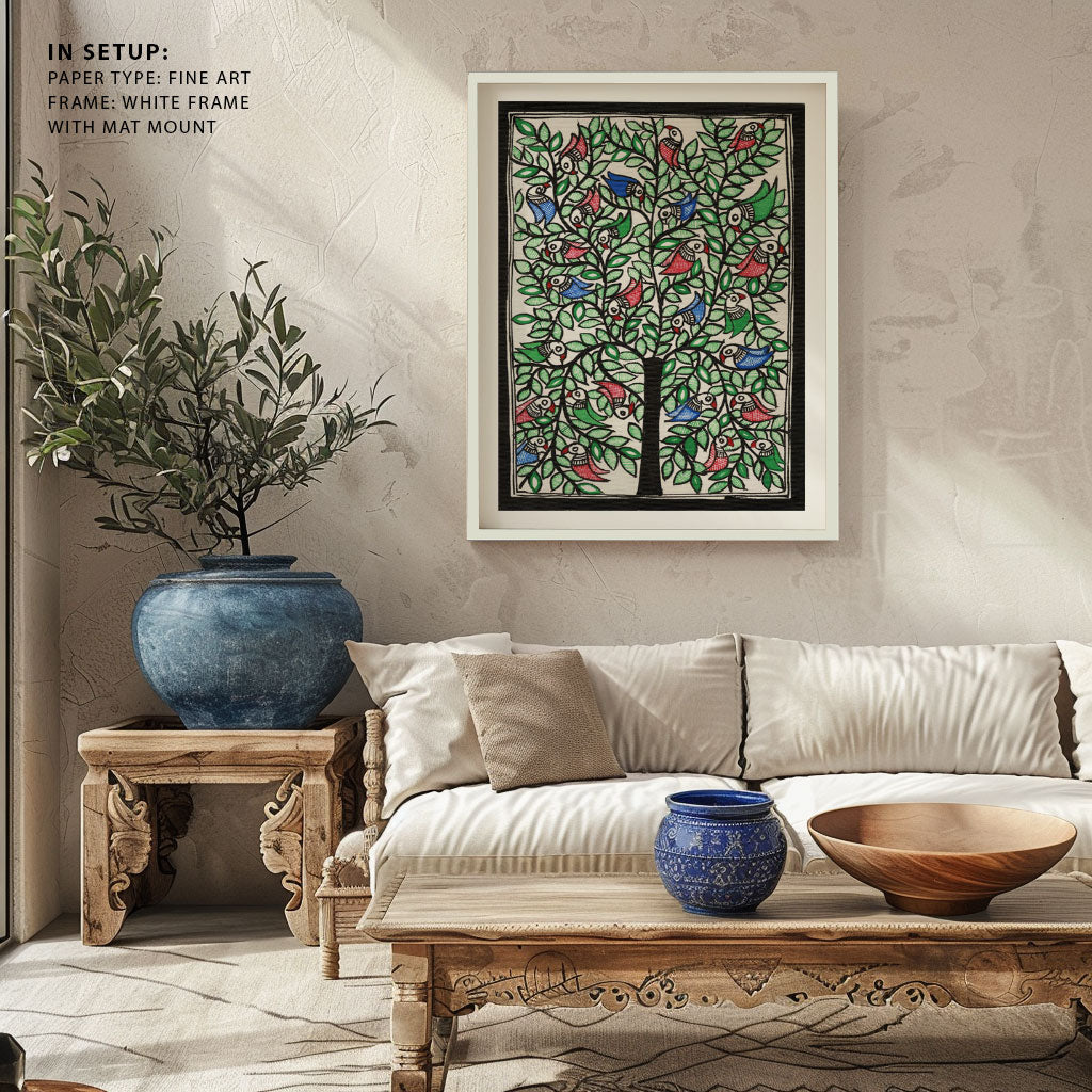Tree Birds Traditional Madhubani Art from the Madhubani Paintings Collection is produced on Premium Museum Grade Canvas and Hahnemuhle Fine Art Media. This beautiful Madhubani Painting Art Print product is made with a matte finish and premium quality with vibrant colors. These Madhubani Miniature Paintings Art Prints are produced with the most extreme shading precision and using the most advanced giclee printing technique in the world. We use the same standard that the various museums and art galleries use across the globe to recreate the Madhubani Miniature Paintings Art Prints. These Madhubani Paintings are perfect for you if you're a Madhubani or Indian Culture Lover or if you want to add a Traditional Look to your space. The vibrancy of colors and the unique detailing of every Madhubani Painting Art Print makes them the best in so many ways. This Madhubani Art Print will add charm to any room in your home. These Madhubani Painting Art Prints can be the perfect gift to your friends, colleagues, or family as they sync in very well in your Bedroom, living room, lobby, Balcony, Bathroom, etc.