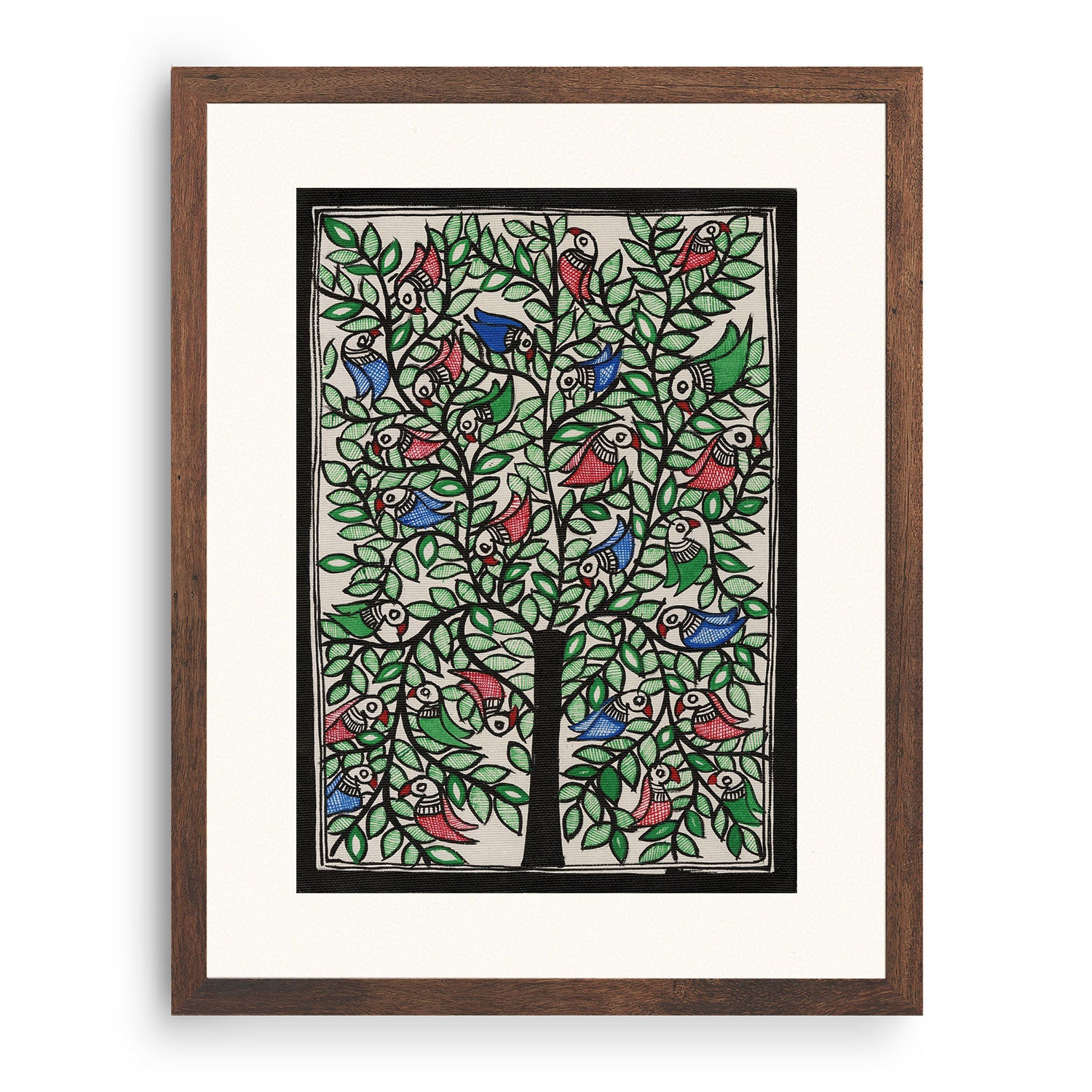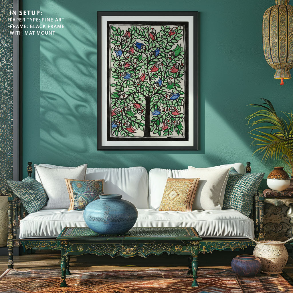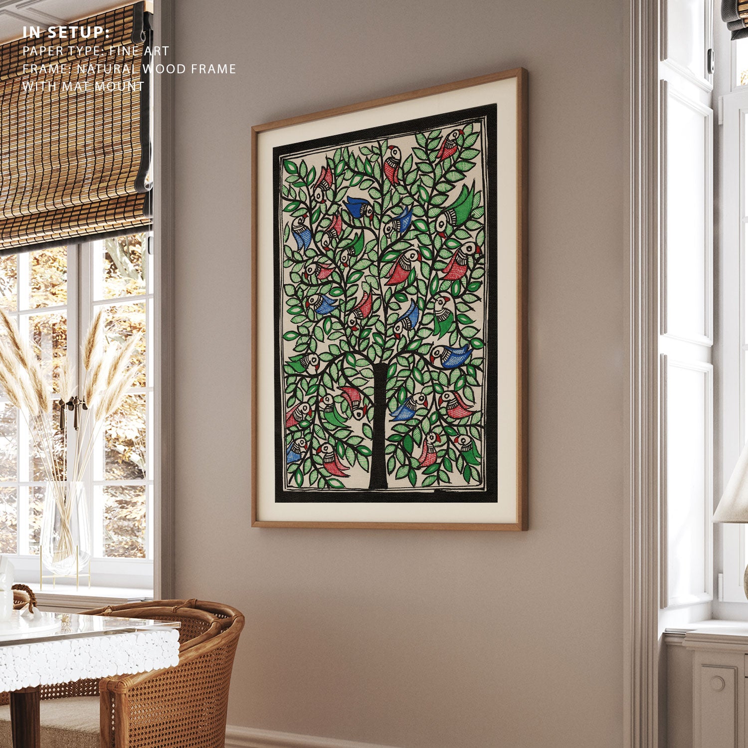 Tree Birds Traditional Madhubani Art from the Madhubani Paintings Collection is produced on Premium Museum Grade Canvas and Hahnemuhle Fine Art Media. This beautiful Madhubani Painting Art Print product is made with a matte finish and premium quality with vibrant colors. These Madhubani Miniature Paintings Art Prints are produced with the most extreme shading precision and using the most advanced giclee printing technique in the world. We use the same standard that the various museums and art galleries use across the globe to recreate the Madhubani Miniature Paintings Art Prints. These Madhubani Paintings are perfect for you if you're a Madhubani or Indian Culture Lover or if you want to add a Traditional Look to your space. The vibrancy of colors and the unique detailing of every Madhubani Painting Art Print makes them the best in so many ways. This Madhubani Art Print will add charm to any room in your home. These Madhubani Painting Art Prints can be the perfect gift to your friends, colleagues, or family as they sync in very well in your Bedroom, living room, lobby, Balcony, Bathroom, etc.